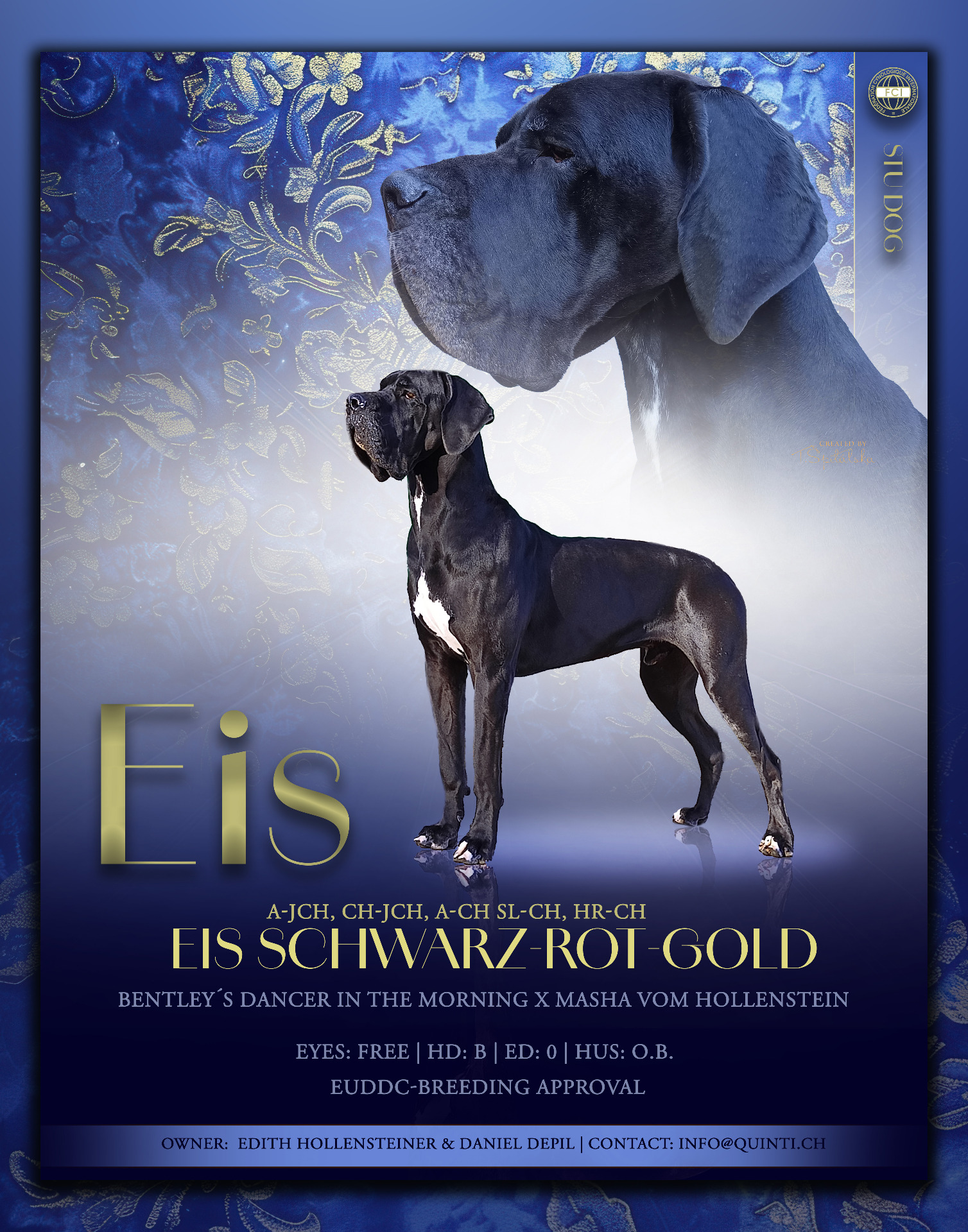 EuDDC Zuchtzulassung, Herzultraschall ohne Befund, Entropium und Ektropium frei, HD: A/B, ED frei