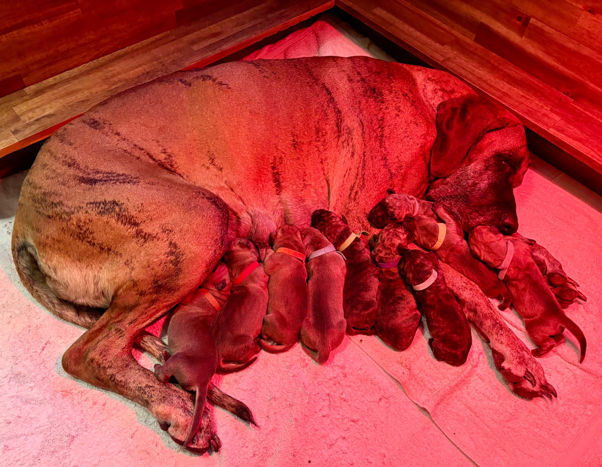 In der Zuchtstätte "von Gsibergerdoggen" wurden am 28.03.2023 nach der schwarzen Hündin "Hermine vom Hause Rösch"und dem schwarzen Rüden "Diamonds Are a Girl´s Best Friend Perseidy Kasjopei" Besitzer: Brumund Niels & Tanja Brumund - Grass, 3/1 schwarze und 0/1 blaue Welpen geboren.